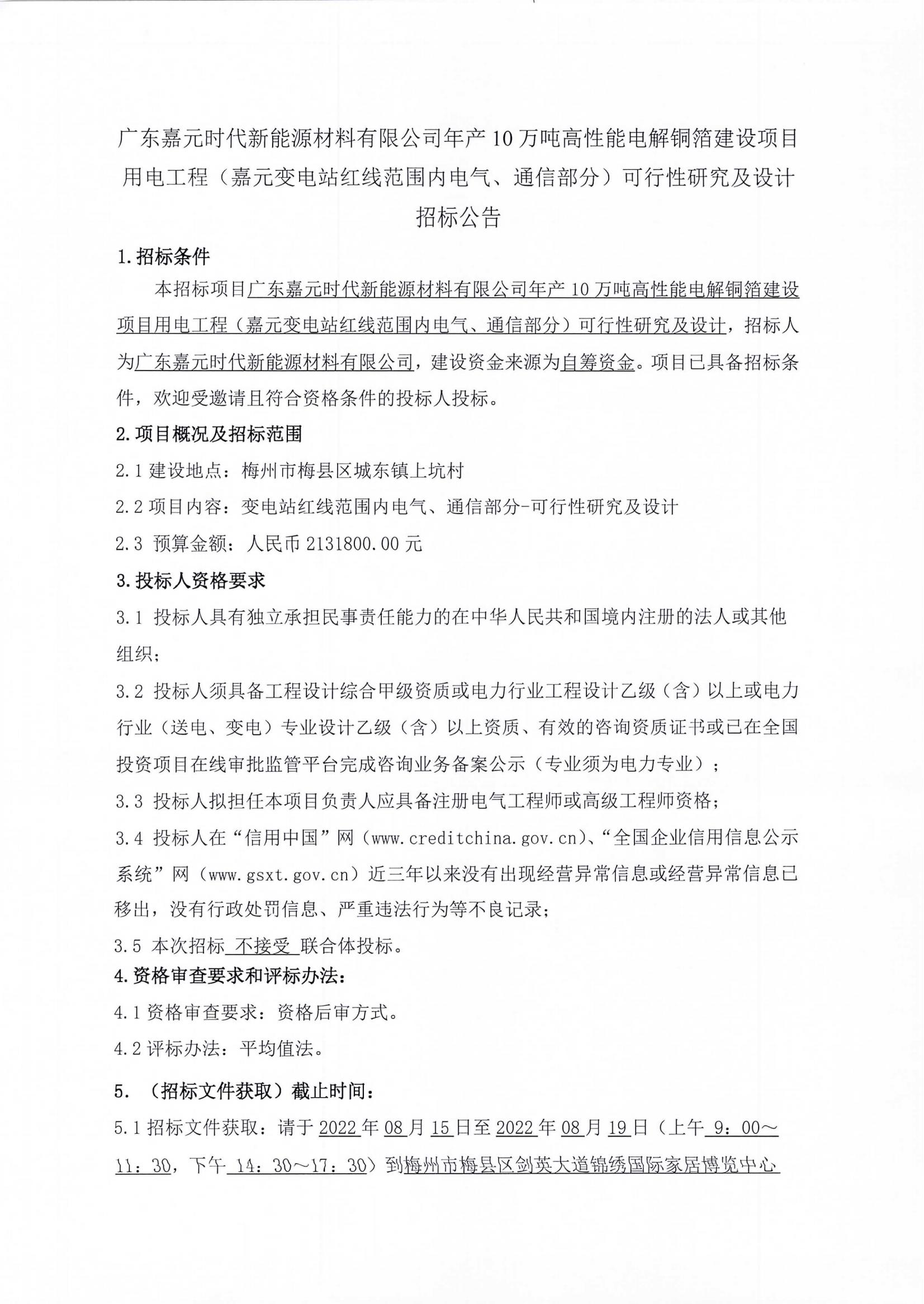 廣東嘉元時代新能源材料有限公司年產(chǎn)10萬噸高性能電解銅箔建設(shè)項目用電工程(嘉元變電站紅線范圍內(nèi)電氣、通信部分)可行性研究及設(shè)計招標(biāo)公告