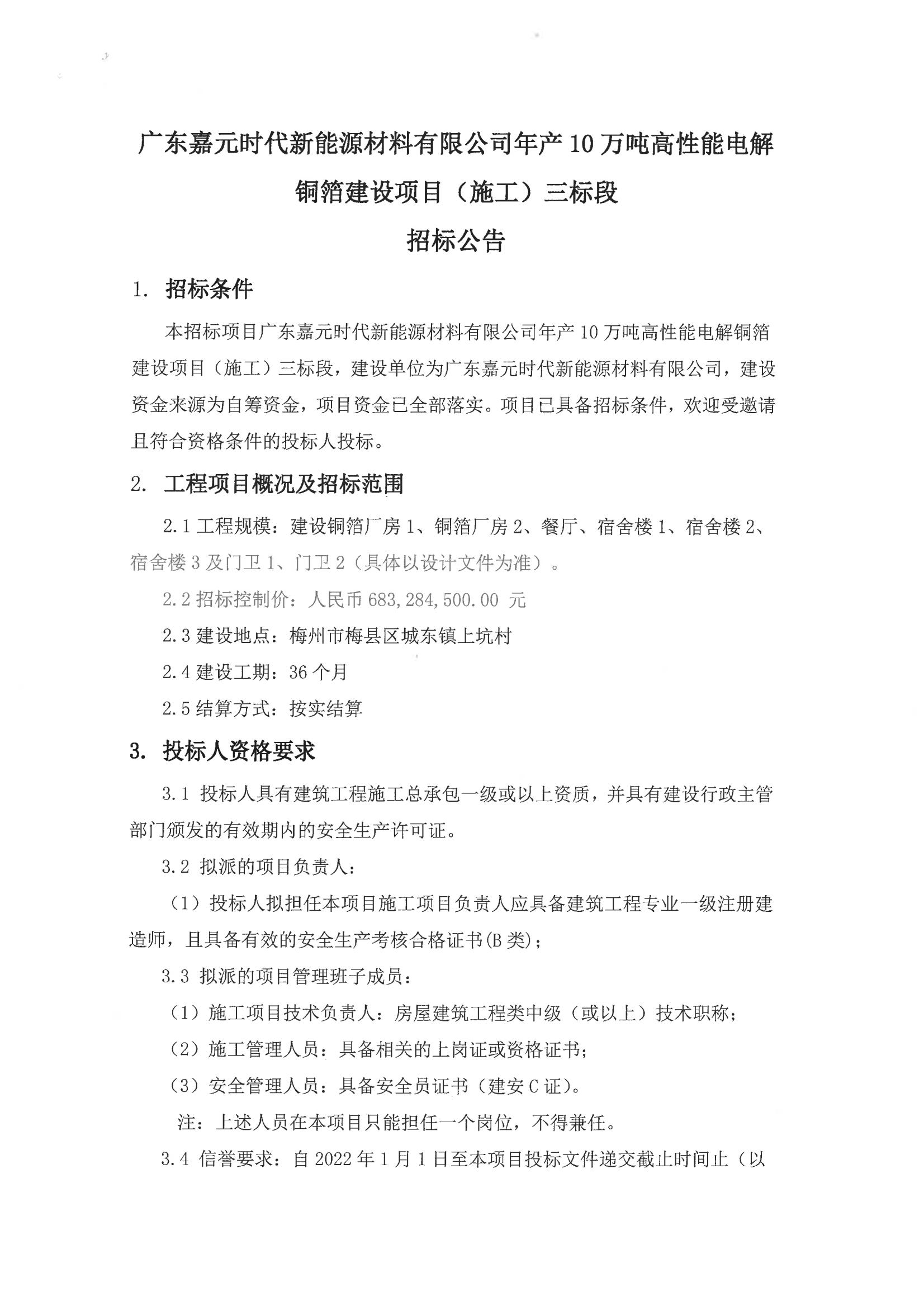 廣東嘉元時(shí)代新能源材料有限公司年產(chǎn)10萬噸高性能電解銅箔建設(shè)項(xiàng)目(施工)三標(biāo)段招標(biāo)公告